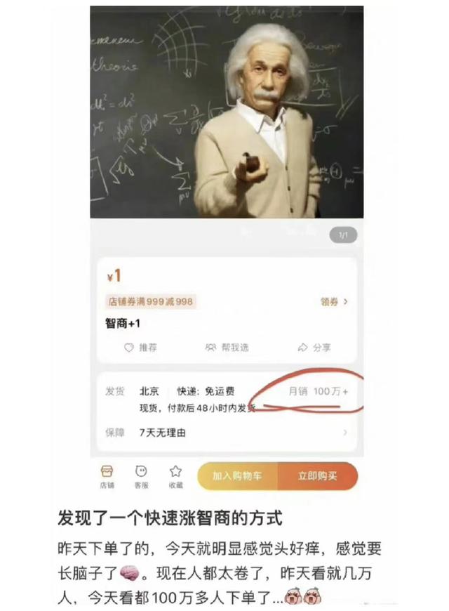 您听说过,有买“智商”的地方吗?当然,这不是什么培训机构,而是淘宝的一个店铺。一块钱就能购买“智商+1”,本是一个店家的行为艺术,竟收到年轻人追捧,月销量破百万。