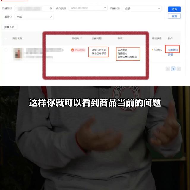 第三,商品的质量分搞到60分以上。优化商品提高质量分,需要点进后台商品优化界面,这样你就可以看到商品当前的问题,和系统给你的智能提醒。告诉你怎么去优化。点击立即优化,填充缺少的商品属性图文信息,让商品达到入池标准,就能够得到曝光了。