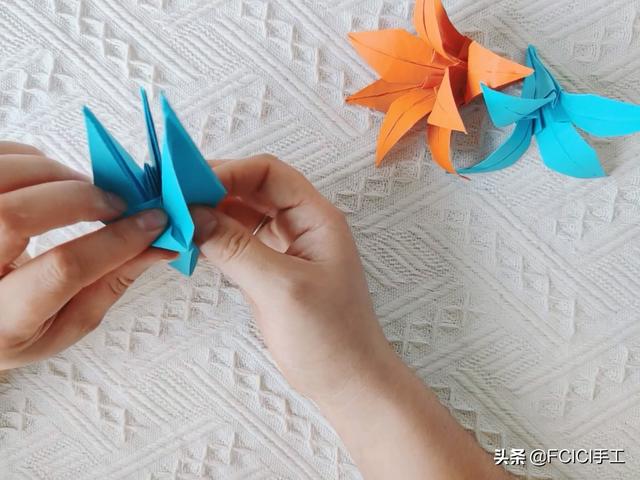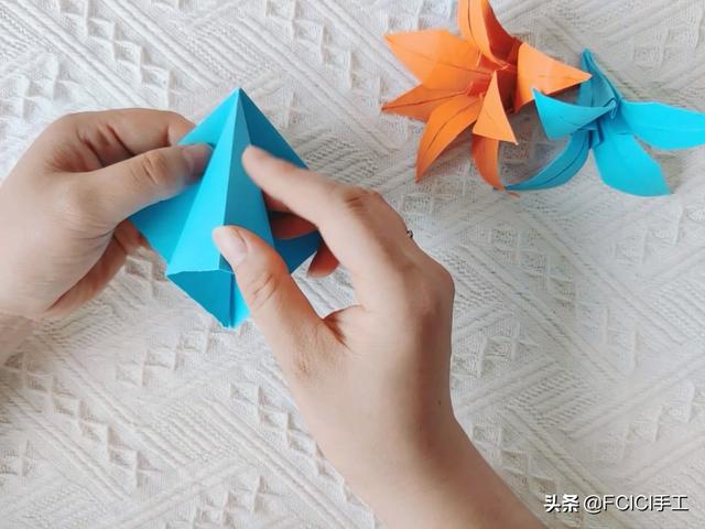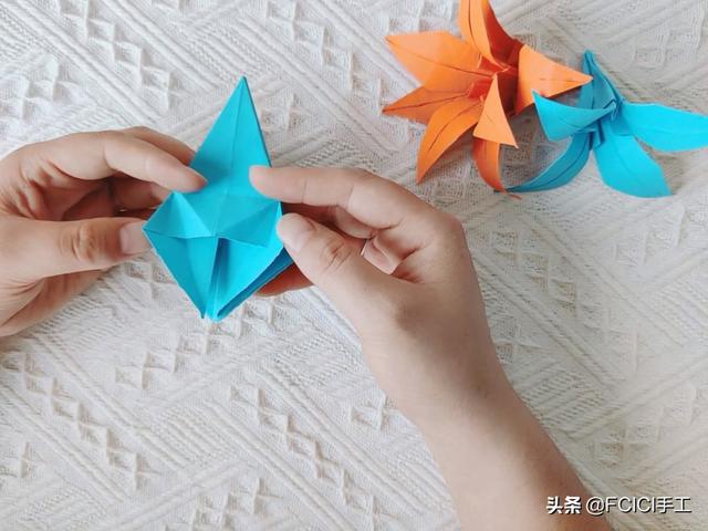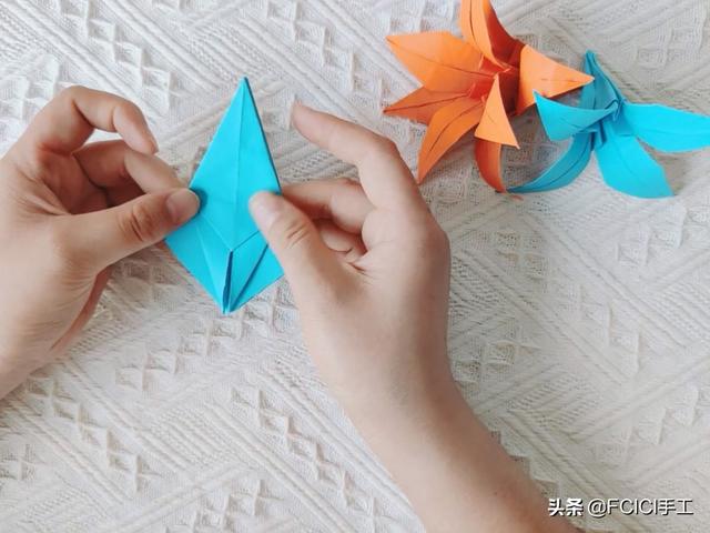 5、最后将花瓣卷出造型。另一张纸重复以上相同动作,折出相同的花瓣,两个组合在一起。一朵漂亮的百合花就制作完成了。