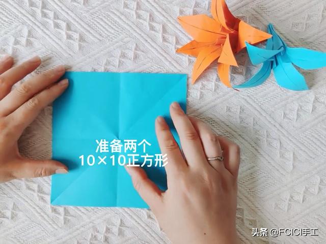 1、准备两张10×10厘米正方形,先折出米字型,再根据折痕折出一个正方形,如下图所示。