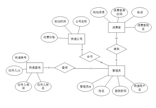 然后再加上该联系自身带的属性。而管理员和快递查询是1:N的关系,需要在快递查询端添加管理员的主键作为外码。由此可知,快递公司的主码是公司名称,没有外码;消费者的主码是消费者身份码,也没有外码;