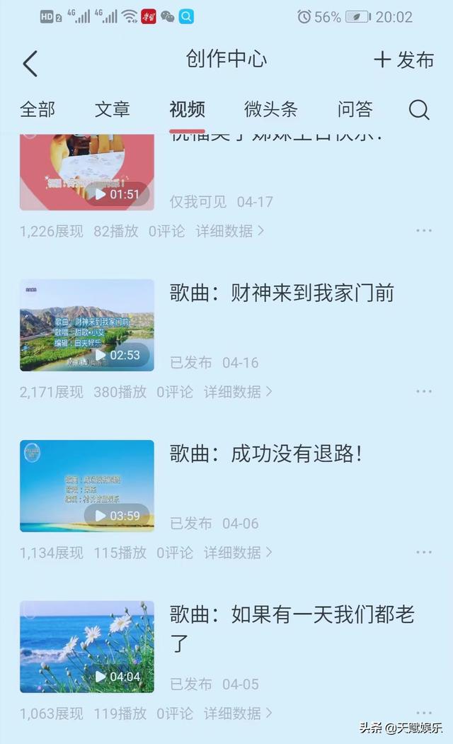 我注册头条号后发布第一个小视频,是在2022年4月5日,以下截图最下端的视频,歌曲:如果有一天我们老了,此时的昵称是:村长甘甜娱乐【影视】,其实在此之前的昵称是村长甘甜影视,因为有位朋友告诉我说:影视不如娱乐好写文章和发布视频,所以改成了村长甘甜娱乐【影视】