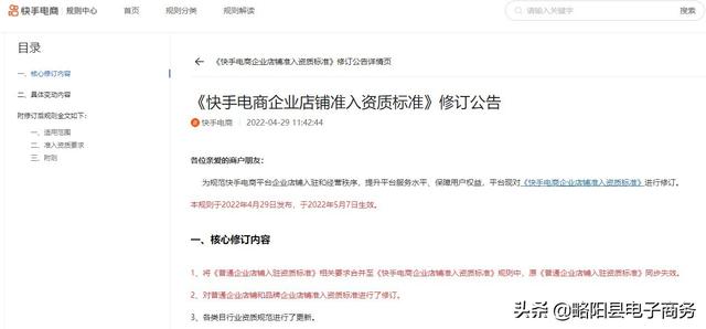值得一提的是,快手电商还修订了《快手电商企业店铺准入资质标准》。该规则将于2022年5月7日生效。