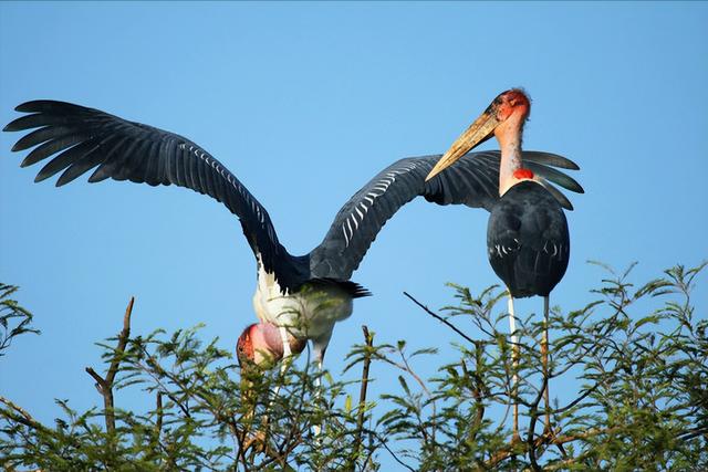 因为这个季节河流的水位浅,秃鹳捕鱼更加方便,可以获得更加充足的食物。秃鹳的交配流程非常简单,由雄性秃鹳在树上或者是悬崖上将树枝等堆积起来。