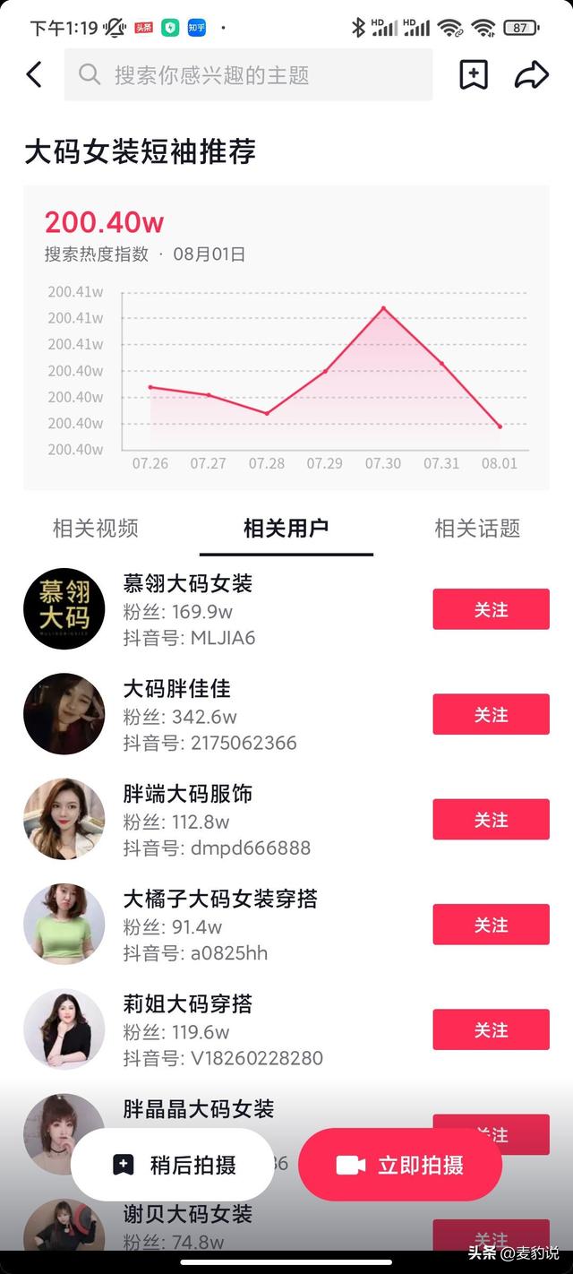 3、然后点击相关用户,里面有至少100个和你同类目的账号,在里面选择你喜欢的风格的账号去分析短视频内容和直播间内容。