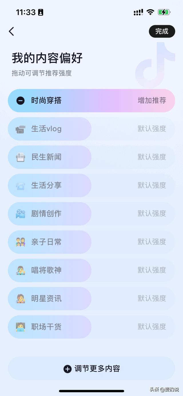 而且这项设置非常的人性化,如果不是推荐页面这些行业的,可以点击调节更多内容,找到自己的行业选项就可以了,按自己的行业把推荐强度拉满,这样你再也不用花大把时间去主动搜索对标账号了。
