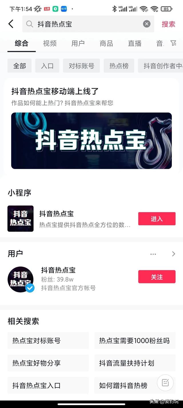 1、点击抖音顶部搜索框,搜抖音热点宝,点击置顶这个图片进入。