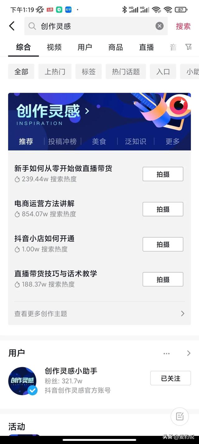 1、点击抖音顶部搜索框,搜创作灵感,点击置顶这个图片进入。