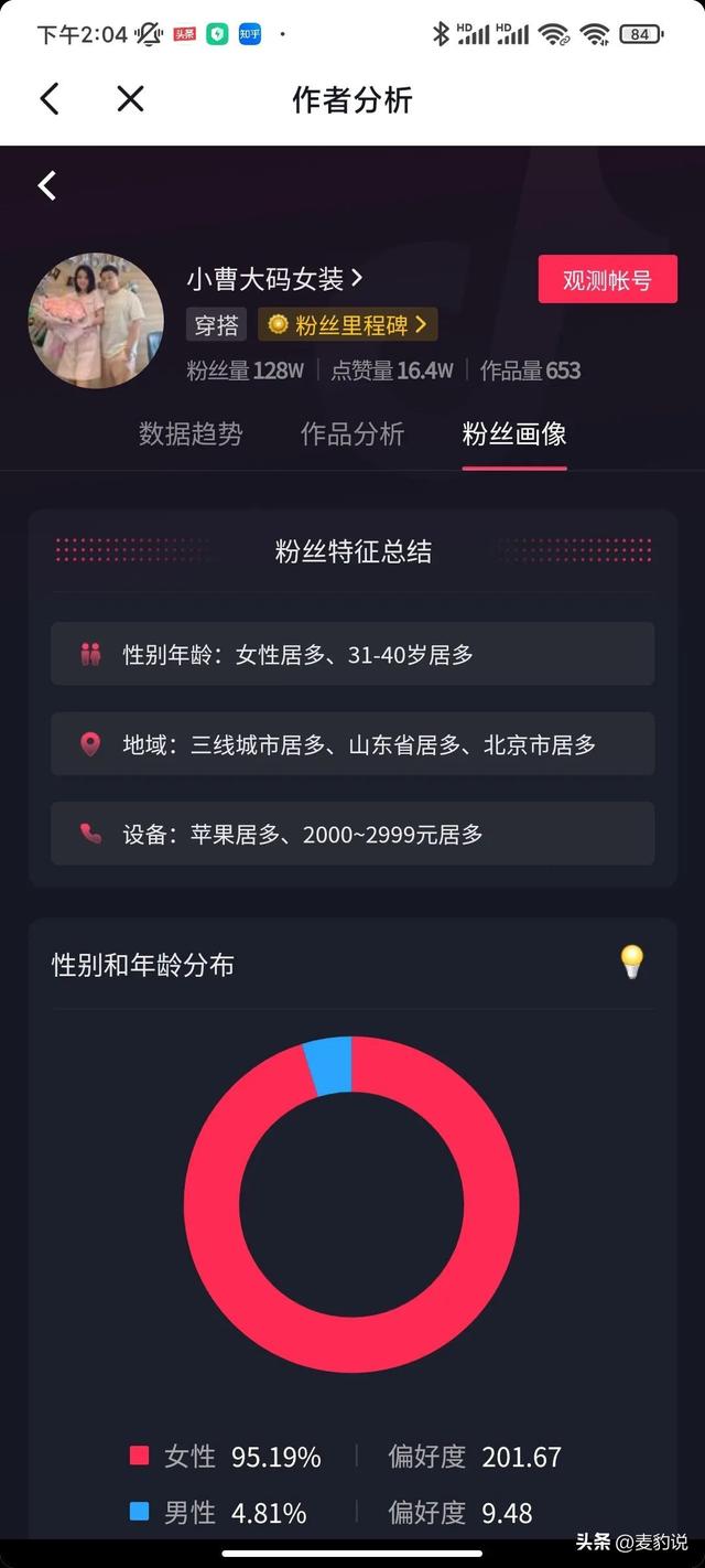 4、点击某一个账号后,可以看到这个账号具体的粉丝画像,看是否和你的目标人群一致,方便后期投放小店随心推时,可以快速找到标签精准度高的相似达人账号。