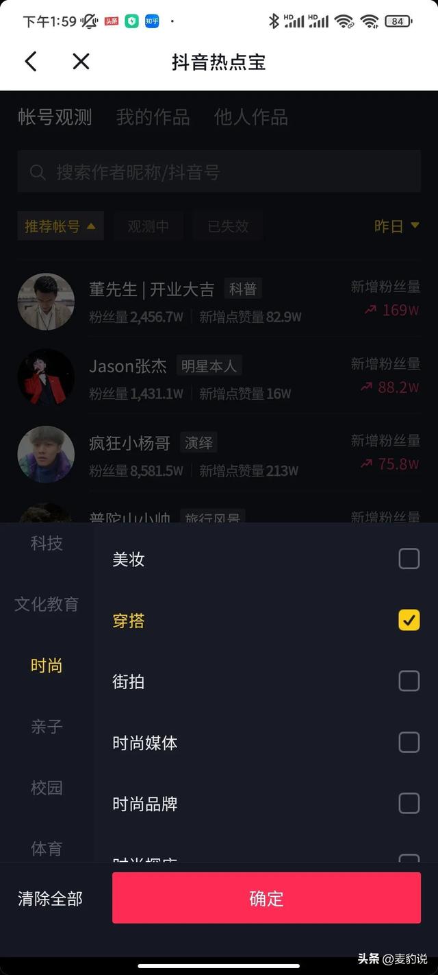 2、进入热点宝,点击观测,选择你所在的直播带货领域,选择相应的细分标签点进去,比如说你是卖服装的,你就可以选择穿搭这个标签。