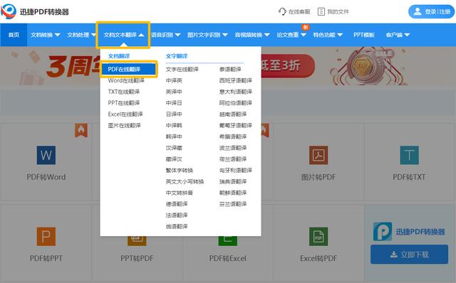 步骤一:首先进入在线PDF转换页面,点击上方菜单栏中的【文档文本翻译】在这点处的功能里点击【PDF在线翻译】按钮。