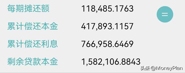 等额本息下10年共还了118.48万,其中41.7万本金,76.6万利息,第20年共还了本金104.8万,利息132.1万,第二个10年的利息比第一个10年利息少;