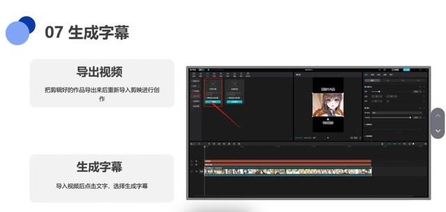 第七步,导出作品。然后重新将导出的作品导入剪映,点击文字生成字幕,查看字幕有没有错别字,有则改过来,改好之后添加背景音乐,导出横屏视频。