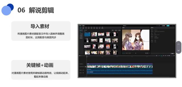 第六步,把漫画截图跟配音文件导入剪映。调整图片时长,确保配音跟画面内容同步,然后给漫画图片加上关键帧动画特效。