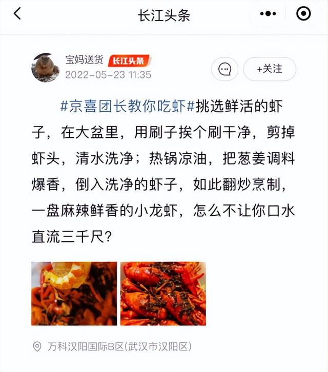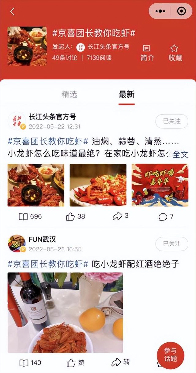 截至5月23日,“长江头条”话题#“虾吃虾喝”免费嘬虾#阅读量已超过15万人次,#京喜团长教你吃虾#阅读量也即将破万。即日起至6月10日,参与话题还有机会获得免费嘬虾券,可到潜江虾皇、楚虾王、虾后门店兑换小龙虾一份。