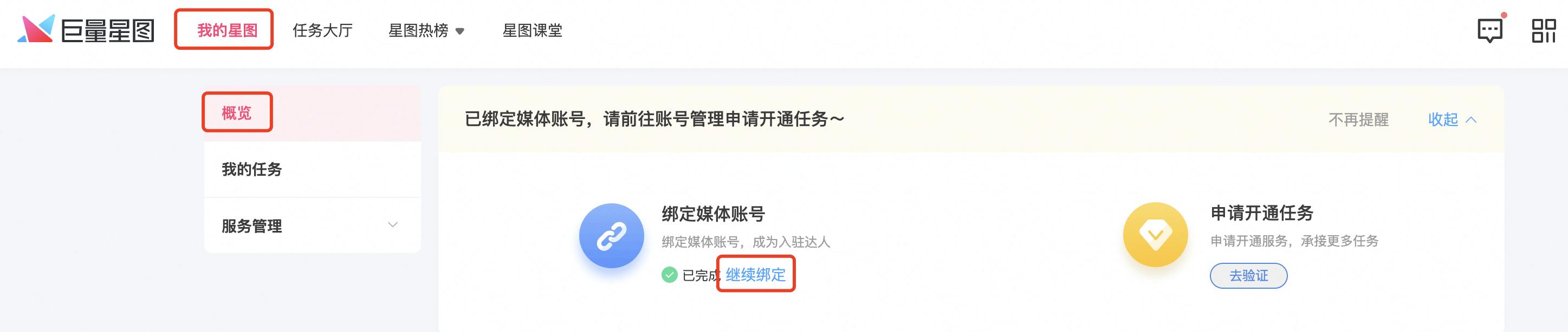 ①进入“我的星图”-“概览”,点击“继续绑定”