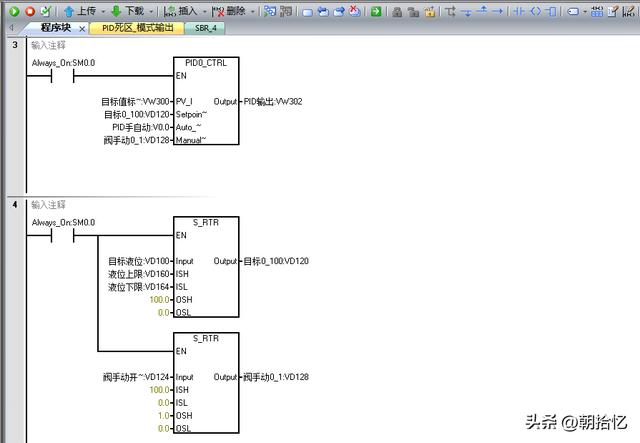 实时液位一旦处于死区上下限范围,PID模式转换为手动,并将此刻的PID标准化输出值传入PID块的手动输出;实时液位不在此范围,PID模式转换为自动,按原有参数运行。