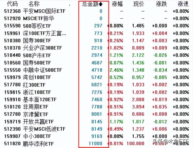比如一堆银行ETF,尽量挑成交量大的,小到离谱的自然也避免介入了。以上列表是在同花顺里敲入“ETF基金”后排序出来的,其实ETF和股票一样,在分时界面也能看到实时交易金额,这里就不多说了。