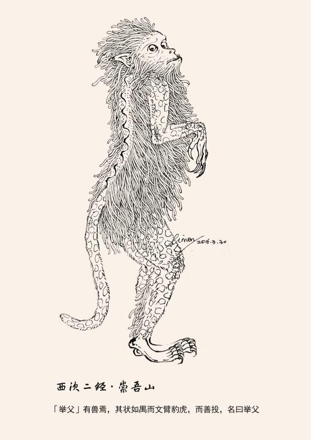 上古时代有另一神通广大的猿猴——夸父。《山海经·西山经》:“有兽焉,其状如禺而文臂、豹虎(尾)而善投,名曰举父(或作夸父)。”禺即猿猴,意指夸父是一只猿。但有学者指出,这种说法是说夸父族的图腾是猿猴。不过不管怎样,除了《山海经》,晋代王嘉《拾遗记》、《神后记》等众多典籍都讲到了猿猴形象,不仅涉及人类对猿猴的崇拜情结,而且投射出人类自身的精神面貌,由此组成一个色彩斑斓的生肖猴文化。