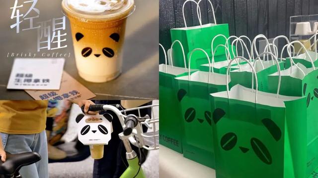 杯子和纸袋上是反常规的方形熊猫,熊猫的眼睛则做成咖啡豆形状,形似“黑眼圈”,寓意喝杯咖啡会“清醒”,给顾客留下难忘的消费记忆点。