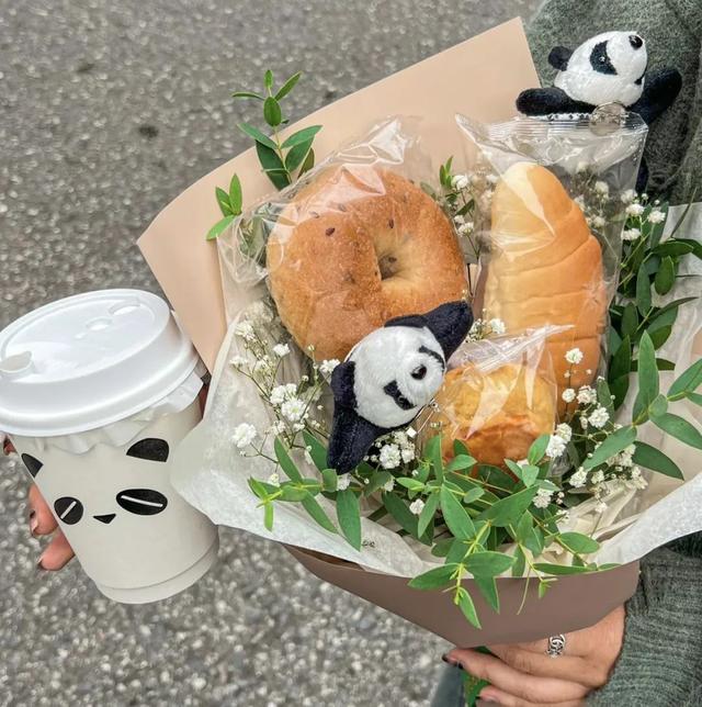 在早餐或下午茶套餐上,轻醒也有布局,面包、贝果等5选1+拿铁/美式,价格15-19元不等,仅半个月,用花束包裹的面包就火爆全网。