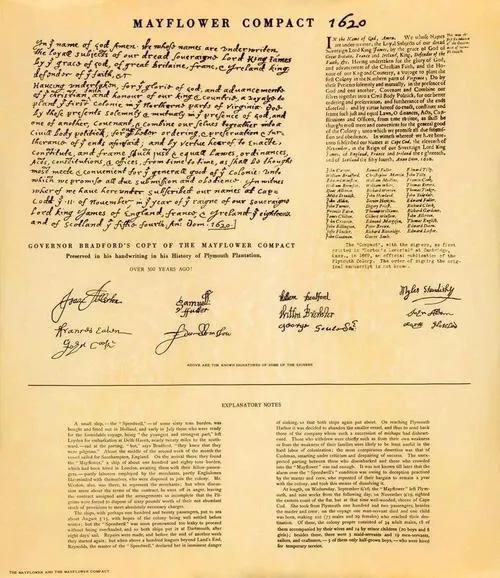 这份《五月花号公约》的开篇就表明了大家是英王詹姆斯一世的子民的身份,而这次远航的目的是“弘扬上帝的荣光、推广基督教义”。