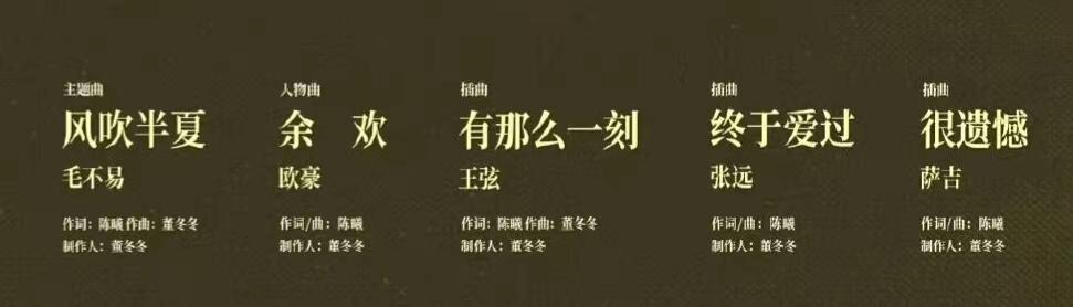 其中包括5首定制原创新歌,欧豪不仅做主演还兼职唱人物曲,苦情歌的代表人物之一张远倾情演唱,更有情歌王子毛不易兜底。