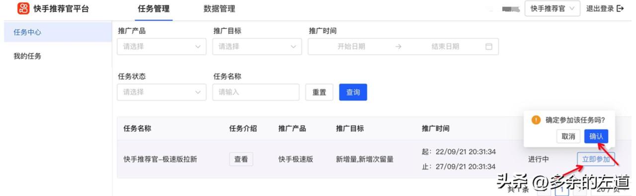 第二步:在 “任务管理” > "任务中心",点击“立即参加”