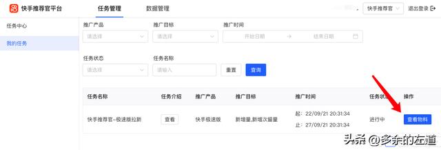 第三步:在 “任务管理” > "我的任务",点击“查看物料”,获取推广码