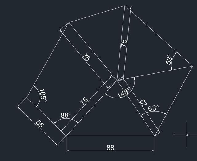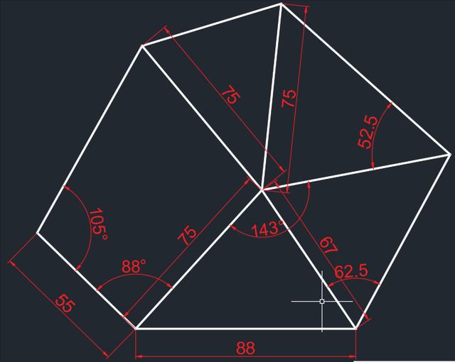 第二步:RO+空格,依次旋转三角形的两个边,旋转角度依次为-62.5°、143、88°(旋转时,一定要复制一个。)旋转出来的线尺寸不准确,我们可以通过拉升(拉伸时,要将正交关掉。)、EX+空格延伸、C+空格辅助圆等辅助手段来调整。最后TR+空格,将不要的修建掉就可以了。