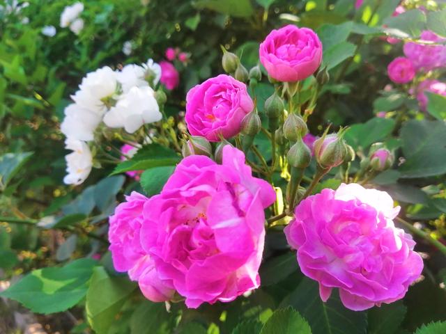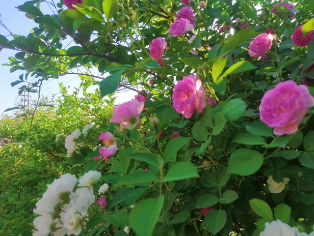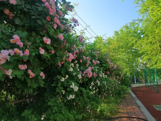 学生未到,老师未到。到的只有我和这爬满墙的蔷薇。放眼望去,白的素而简洁,单瓣,纯净,如着夏裙的小女生。粉的雅而妖娆,宽宽向阳,开我的花,让别人看去吧。红的华而厚实,如人生得意状,披红挂绿,趾高气扬,众花之中,笑傲江湖。