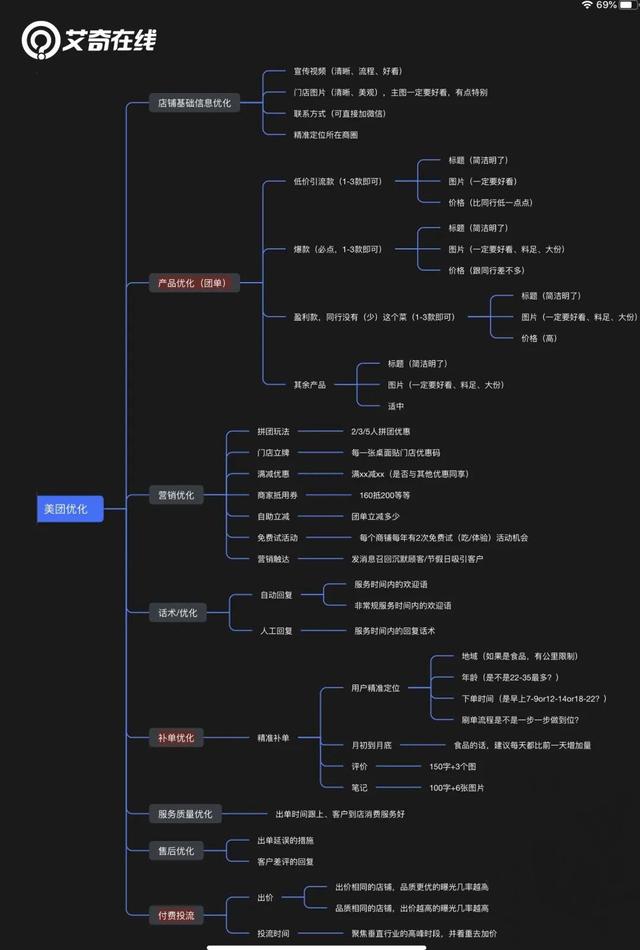 前面说了,想要把店铺的排名弄上去就要做一个美团的全面优化。下面是我做的美团全面优化的一个思维导图。如果你家店铺排名低,那请按照这个图,一点一点去优化。