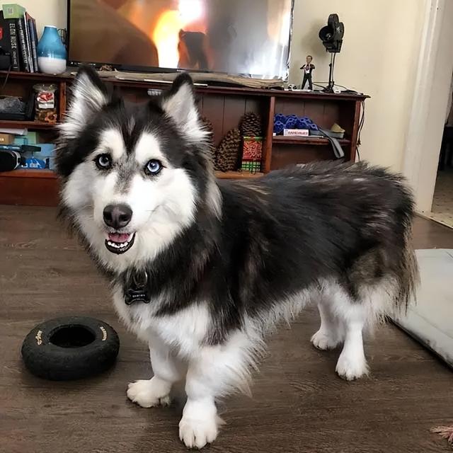 柯基与哈士奇的混血——柯基与哈士奇的混血是近年来尤其受欢迎的一种混血方式。大家觉得帅气的哈士奇配上小短腿一定有出其不意的效果,然而基因这东西不完全跟随人的愿望,所以有的很帅气,有的却很蠢萌。像这只活生生一张哈士奇的大脸安在了柯基的五短身体上,滑稽,果然连哈士奇都改变不了柯基小短腿的基因。