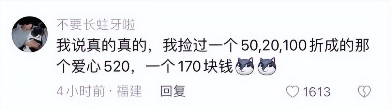 “我说真的真的,我捡过一个50,20,100折成的那个爱心520,一个170块钱”