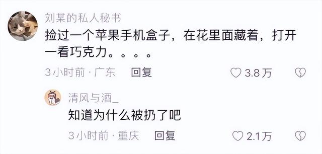 “捡过一个苹果手机盒子,在花里面藏着,打开一看巧克力。。。。”