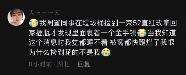 “我闺蜜同时在路边捡到一束52直红玫,拿回家插瓶才发现里面裹着一个金手镯,当我知道这个消息时,我觉都睡不着,被子都快被我蹬烂了,恨为什么捡到花的不是我!”