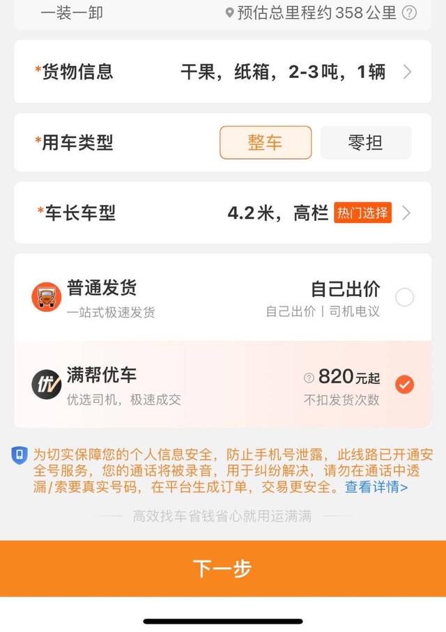 2月28日,记者使用满帮平台下的货车帮随机输入济南至日照的一车货,358公里的距离,无论是普通发货或是满帮优车服务,都出现了820元的参考价格。使用满帮优车服务,最低运费价格可输入820元,货主可加价;普通发货输入900元以下的价格则被提醒运价过低接单时间可能较长,只能输入900元以上价格。