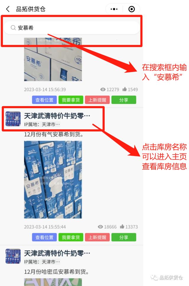 例如我需要安慕希的货源信息就在搜索栏内输入“安慕希”相匹配的货源就有了。点击库房名称进入库房主页可以查看库房的货品以及库房信息。